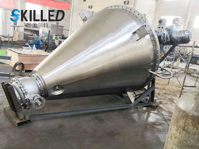 工作原理本机由加热锥体设有加热夹套,热源为热水、导热油或低压蒸汽,从而使锥体内壁保持一定的的温度。变频调速电机经平行斜齿轮减速机,驱动单螺带搅拌器旋转,带动物料沿锥型筒旋转并自下而上提升,物料到达高点后由重力和惯性作用,自动流向旋涡中心回到锥型筒体底部,整个过程使物料在锥型筒体内强制加热,相对对流、掺混,热量在物料中相互扩散,使物料作全方位的不规则往复运动,完成物料同单螺带和筒壁表面进行高频率传热交换,在短时间内达到加热干燥的效果。从而使物料内部水份不断蒸发,在真空泵的作用下,水蒸汽由真空泵引出,如须回收液体可加冷凝器、回收液储罐回收。干燥完成后,打开下部的出料阀出料。