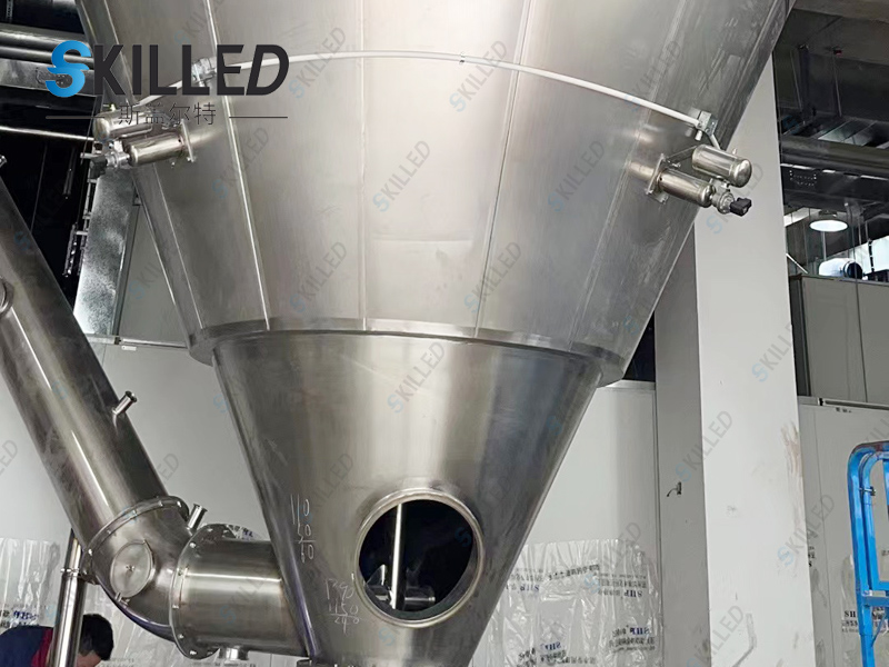 工作原理空气经空气过滤器后进入空气加热器,当空气加热器到给定的温度后以切线方向进入热风分配器,经热风分配器作用后的空气,均匀地、螺旋式地进入干燥室,同时料液由雾化器雾化为20~60um的雾滴,当雾滴与热空气接触后就迅速汽化干燥为粉末或颗粒产品。采用旋风风离器直接收集后经气力输送至效料仓,完成物料的冷却及输送,废气由风机排出口经水沫除尘器排出。