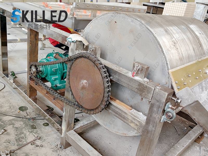 该机由液体变固体粒状,主要是通过造粒模头造粒,采用回转式钢带连续进行,通过喷淋水冷却定型。