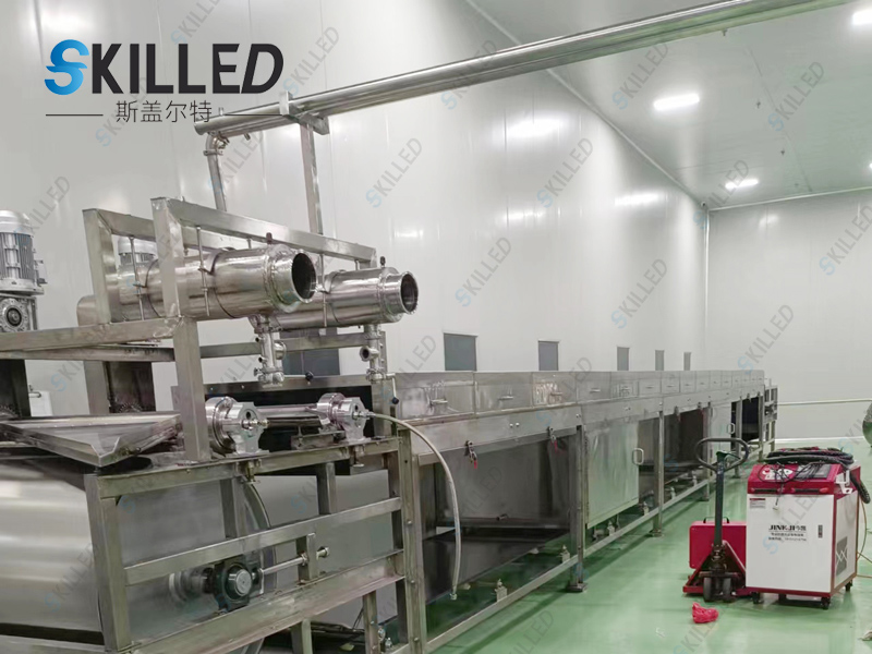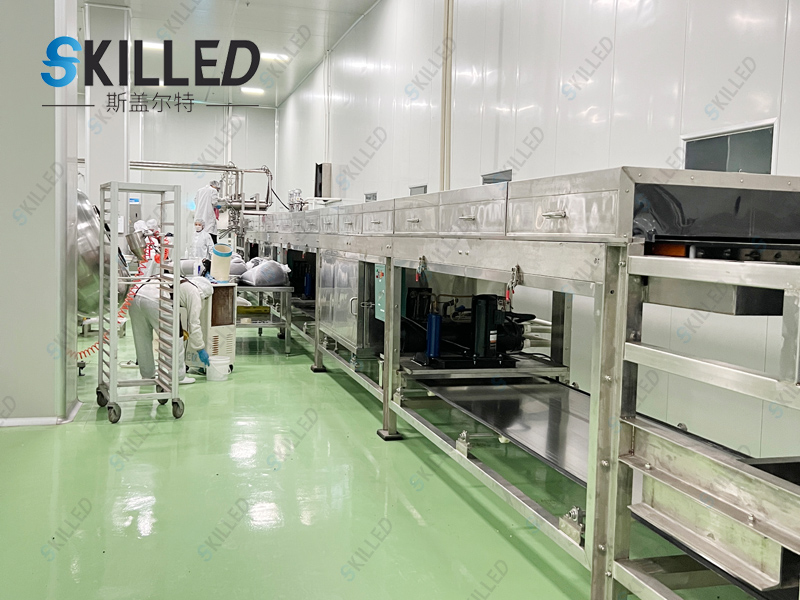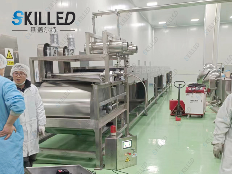巧克力造粒机是利用物料的熔点低于250℃的特性,根据物料熔融态时的粘度范围,通过特殊的布料装置将熔融液均匀在其下方匀速移动的钢带上,在钢带下方设置的连续喷淋装置的冷却作用下,使物料在输送、移运过程中得到冷却、固化、包装,从而达到造粒成型的目的。